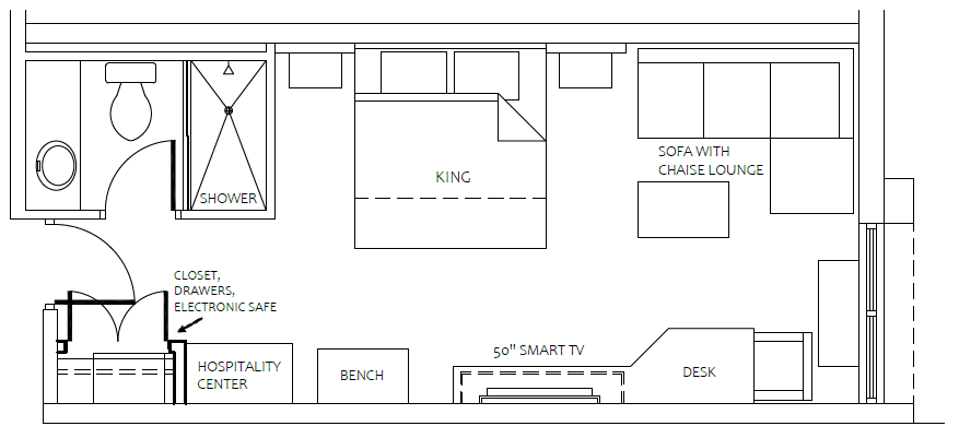 Our Deluxe King guest room features a king bed and comfortable chaise sofa with a leather ottoman. Adequate, well-placed outlets and a floating desk with modern accent chair provide plenty of workable space. Enjoy a 50” Smart TV, CubieBlue clock, and a hospitality center which provides ample counter space, a coffee maker, microwave, and refrigerator. An enclosed closet with built in drawers and electronic safe provide additional storage. The bathroom features an enclosed glass shower and a lighted round mirror.